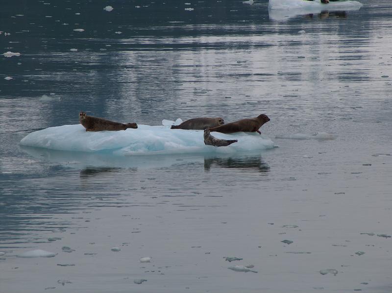 About halfway through the cruise was the part that was for observing the glaciers up close. The captain shut off the engines, and we could easily hear the ice creaking and cracking with portions breaking off and crashing into the water. While we were there, all the parts that calved and tumbled down were fairly small. In one area was an ice flow that had many harbor seals lounging on icebergs. They would slip in the water as we approached.